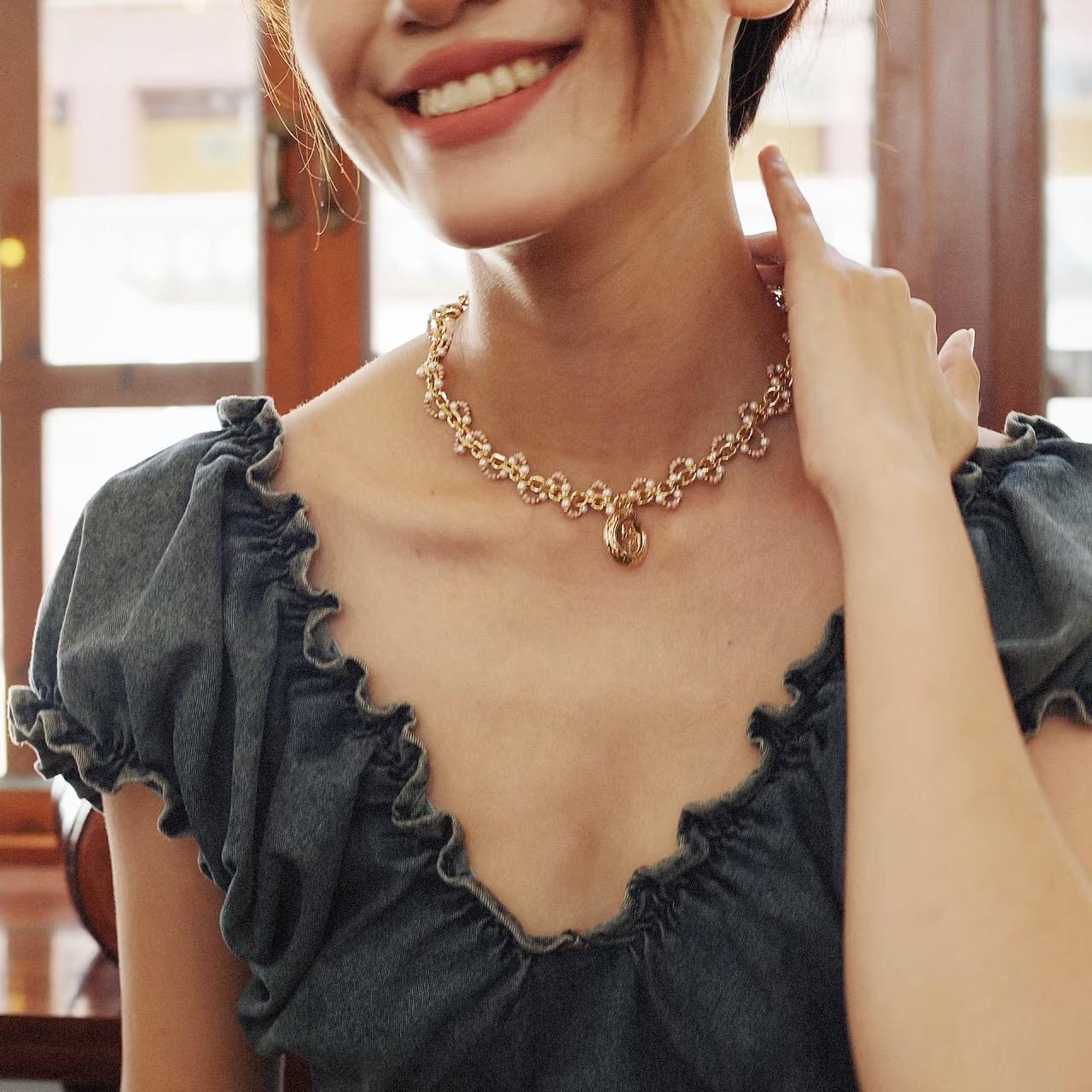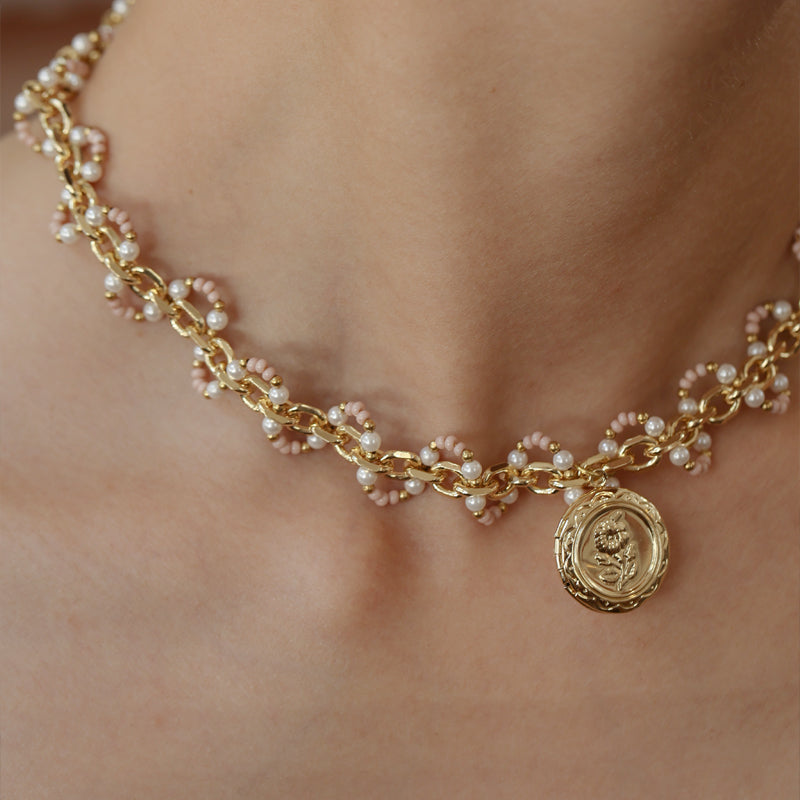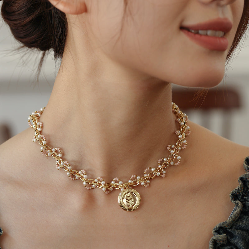 The Roselle Wave Medallion Necklace is a romantic statement choker featuring luminous Swarovski crystal pearls, delicate glass beads, and warm copper accents woven along a gold-plated chain. The clustered beading creates a soft wave-like texture that wraps gracefully around the neckline, leading to a vintage-inspired medallion pendant that adds depth and old-world charm. Rich in detail yet refined in silhouette, this pearl and medallion necklace evokes heirloom elegance with a modern sensibility. Perfect for special occasions or elevating everyday looks, it brings warmth, femininity, and subtle radiance to any ensemble.